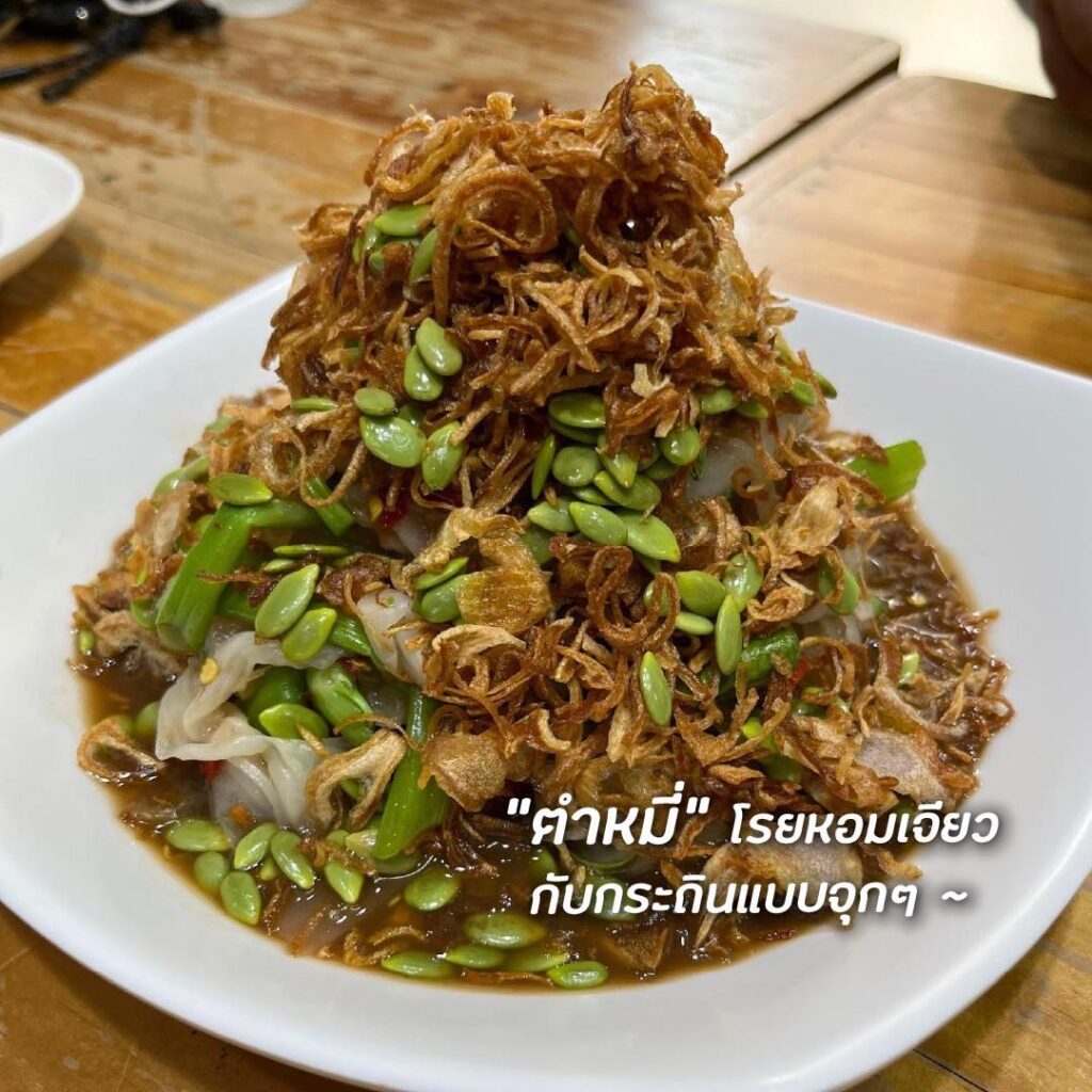 ตำหมี่ นี่ก็เป็นอีกเมนูที่ร้านแนะนำให้สั่ง จะเป็นส้มตำที่ใส่เส้นเล็ก ผักบุ้ง หมึกกรอบ โรยด้วยหอมเจียวและกระถิน texture ตอนเคี้ยวทุกอย่างรวมกันคือกรุบๆ นัวๆ อร่อยแบบไม่เคยกินร้านไหนมาก่อน