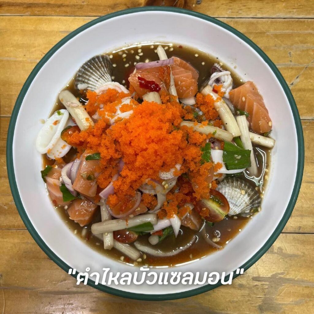แอดมินสั่งเมนูแนะนำของทางร้านคือตำไหลบัวแซลมอน ท็อปด้วยไข่กุ้งจุกๆ แซลมอนชิ้นหนานุ่มดีเว่อ กินกับไหลบัวกรุบๆ ชุ่มน้ำปลาร้าสูตรพิเศษของทางร้าน นัวจนหยุดไม่อยู่