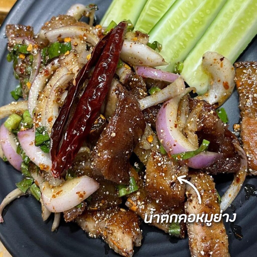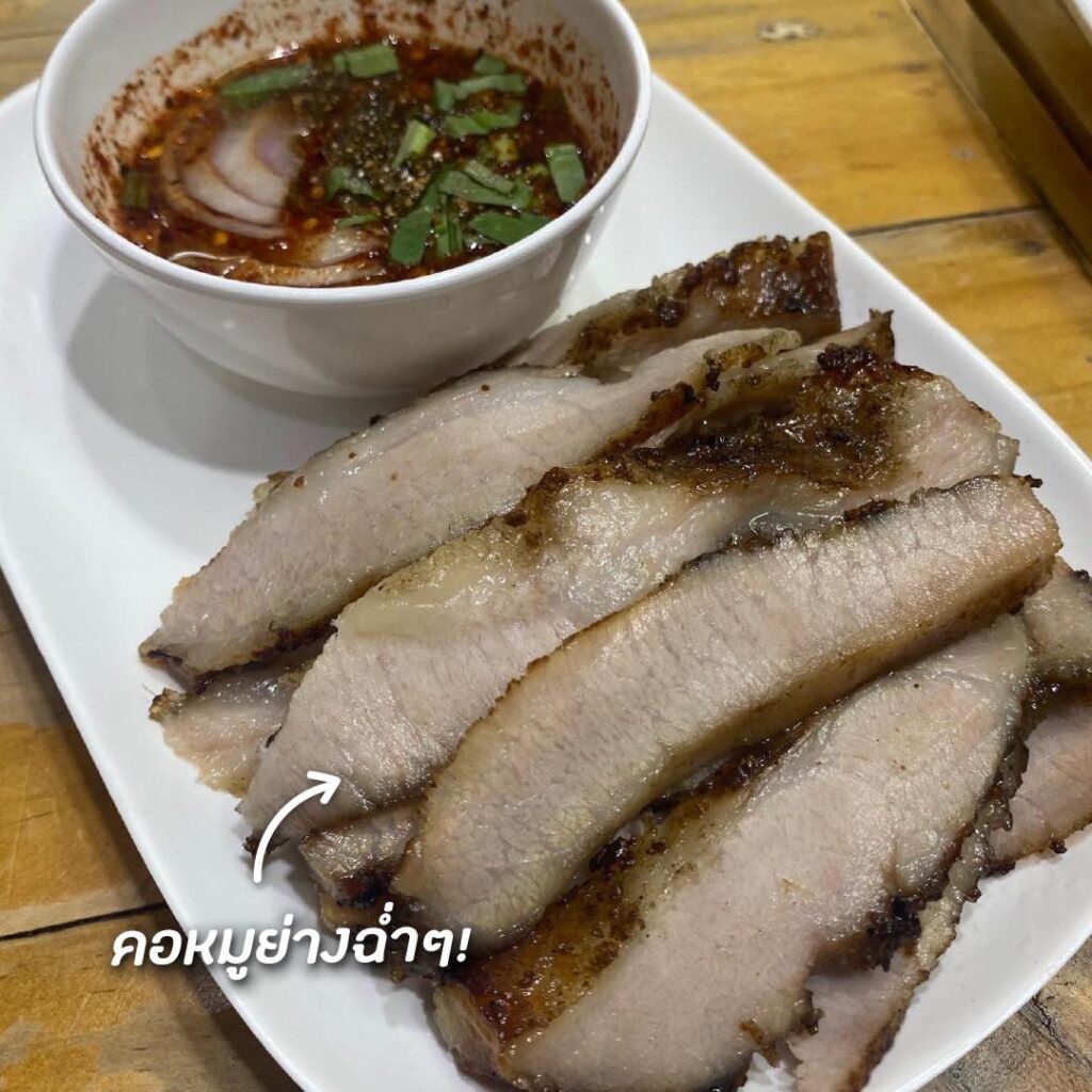 คอหมูย่าง เป็นหมูชิ้นใหญ่ มีมันแทรกฉ่ำๆ จิ้มน้ำจิ้มแจ่ว หรือจะสั่งเป็นน้ำตกคอหมูย่างก็แซ่บไปอีกแบบ