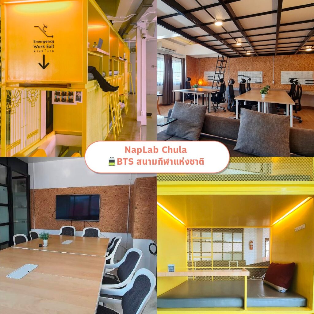ว่ากันว่าที่ NapLab Chula เป็นที่ทำงานที่ไม่ได้งาน (เอ๊ะ?) เพราะนอกจากจะเป็น Co-working Space ที่ให้บริการแบบครบวงจรแล้ว โซนพักผ่อนให้หายเครียดจากการทำงานก็มีมากมายเช่นกัน ทาง NapLab มีการจัดสรรโซนให้บริการหลากหลาย ไม่ว่าจะเป็นโซนห้องประชุม โซนทำงาน โซนนั่งพักผ่อน อีกทั้งยังมีห้องน้ำ ห้องอาบน้ำ รวมไปถึงเคฟตู้นอนสำหรับเหล่าคนทำงานที่โต้รุ่งกันถึงเช้า และเป็นที่รู้กันดีว่ากองทัพต้องเดินด้วยท้อง ภายในยังมีคาเฟ่ราคาย่อมเยาว์ให้บริการอีกด้วย เรียกได้ว่าเป็นบ้านหลังที่สองของชาวออฟฟิศเลยก็ว่าได้
