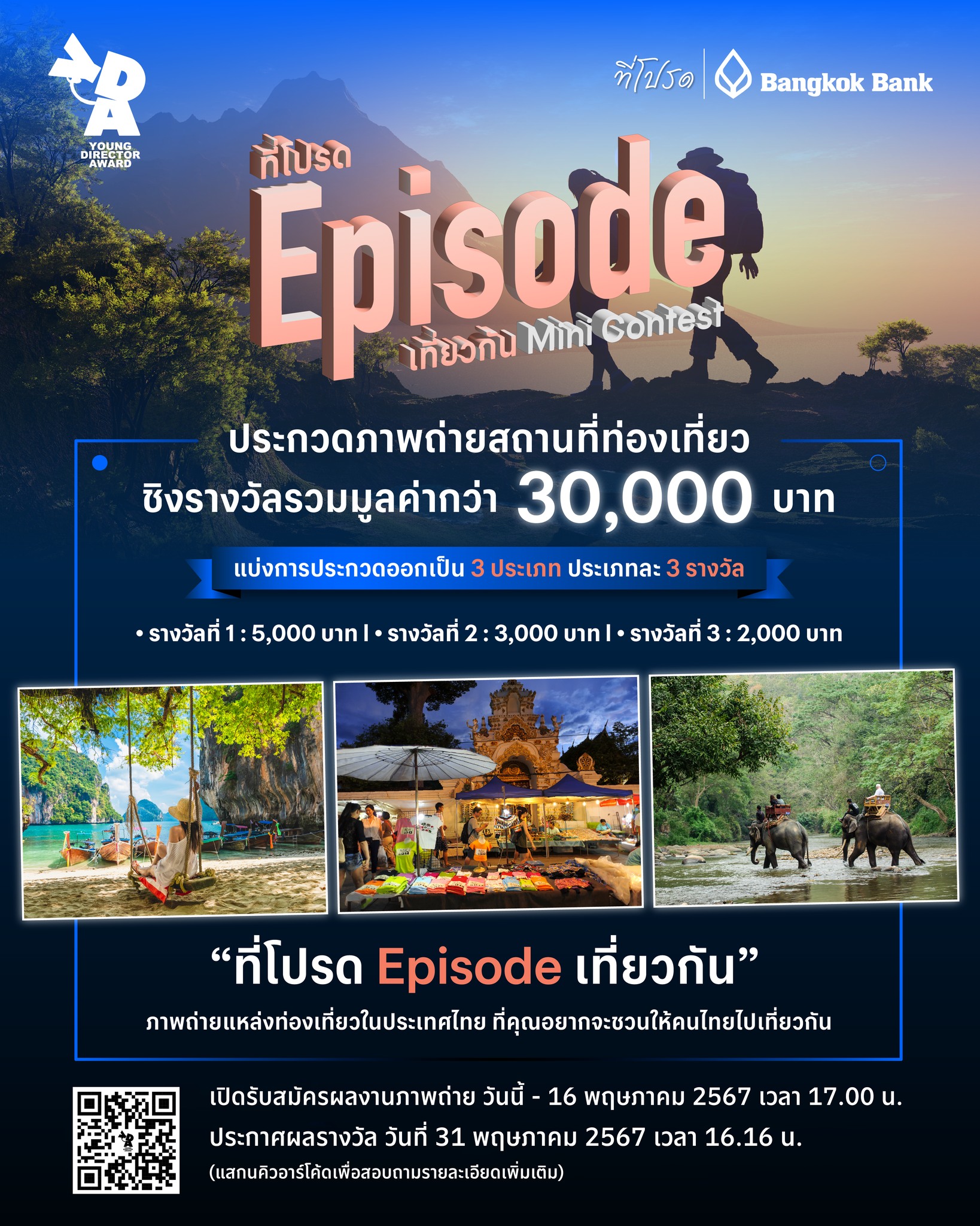 เพจที่โปรด ร่วมกับโครงการ Young Director Award – ผู้กำกับน้อย ขอเชิญชวนนักเดินทางผู้รักในการถ่ายภาพทุกท่านส่งผลงานร่วมสนุกในกิจกรรมประกวดภาพถ่าย “ที่โปรด Episode เที่ยวกัน” Mini Contest บอกเล่าเรื่องราวของสถานที่ท่องเที่ยวที่อยากจะเชิญชวนทุกคนไปเที่ยวด้วยกัน ชิงเงินรางวัลมูลค่ารวมกว่า 30,000 บาท พร้อมเกียรติบัตรจากทางธนาคารกรุงเทพ เพื่อเป็นการประชาสัมพันธ์สถานที่ท่องเที่ยวประเทศไทยให้เป็นที่รู้จักและเป็นจุดหมายปลายทางของนักท่องเที่ยวมากขึ้น
