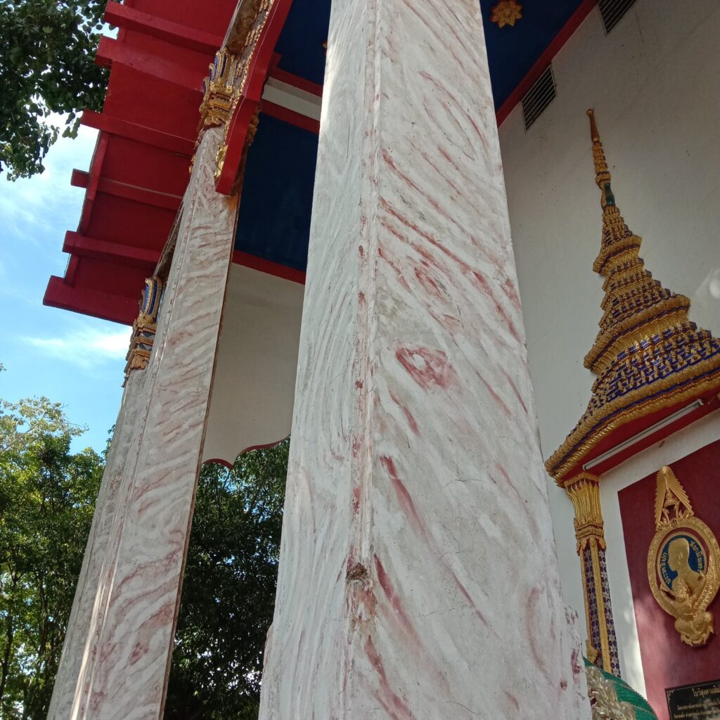 มาถึงส่วนของพระอุโบสถ ในส่วนนี้จะมีอะไรที่น่าดูค่อนข้างเยอะ โดยจุดแรกก็คือในส่วนของเสาพาไลด้านหน้าที่เป็นลายหินอ่อนสวยงาม แต่รู้ไหมว่าจริง ๆ แล้วมันไม่ใช่หินอ่อนแต่อย่างใด เป็นแค่เสาปูนธรรมดาแต่มีการวาดลายลงไปเพื่อหลอกตาให้ดูเหมือนหินอ่อน