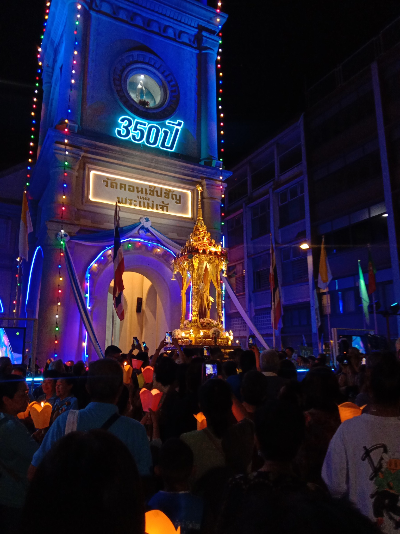 ในส่วนของแม่พระที่ถูกนำมาแห่ในงานฉลองวัดนี้เป็นคนละองค์กับแม่พระไถ่ทาสที่เราเคยหยิบนำมาให้ชมเมื่อคราวก่อน โดยจะประดิษฐานอยู่ในบุษบกทรงไทย แห่เหมือนกันกับแม่พระไถ่ทาส