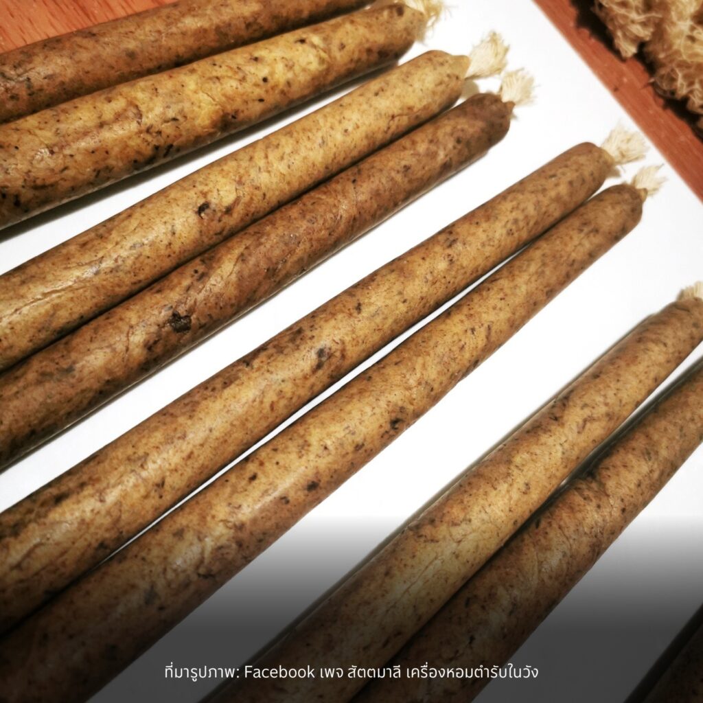 ไส้เทียน พันด้วยเครื่องหอมชั้นเลิศ เช่น กำยาน พิมเสน แก่นไม้จันทน์ กฤษณา และชะลูด