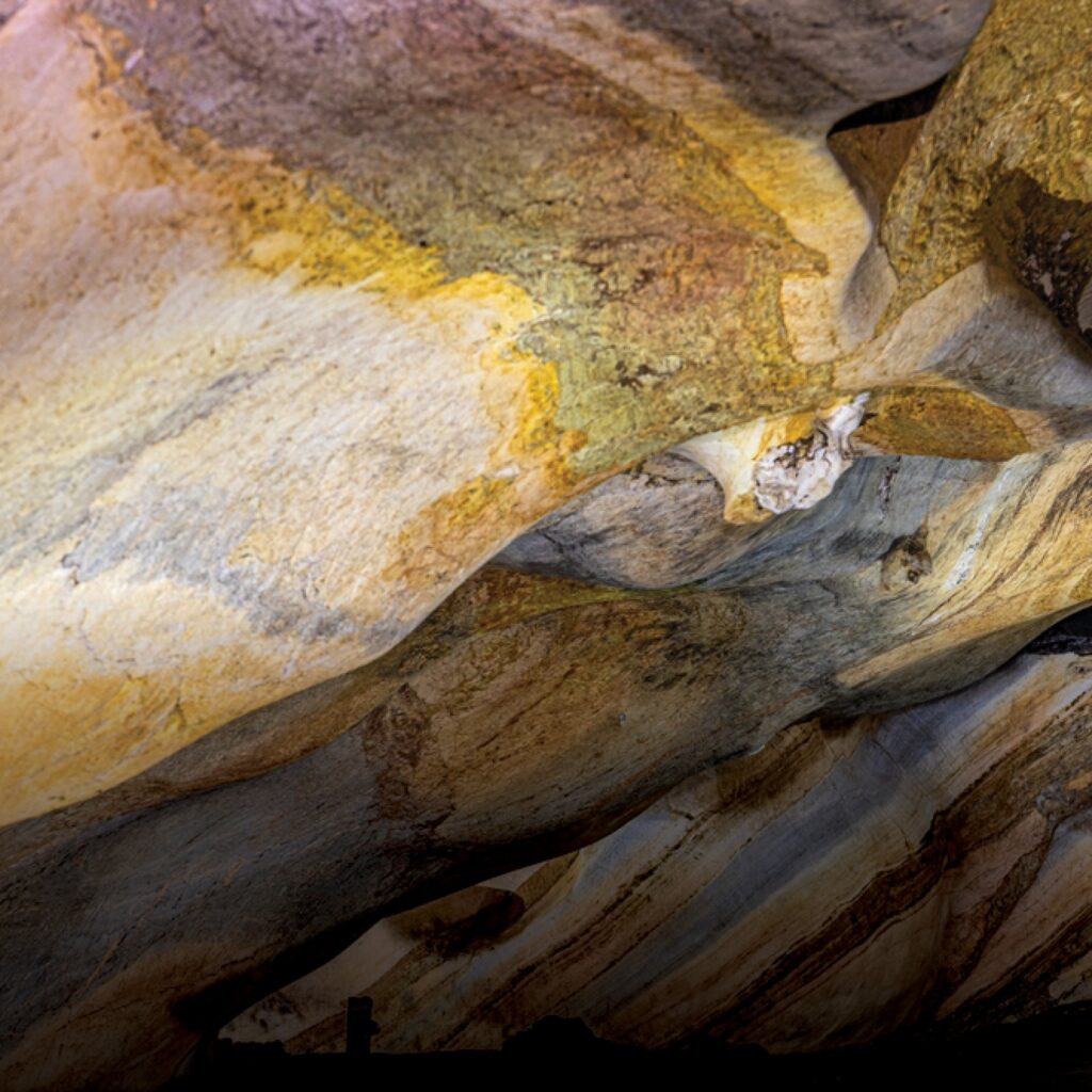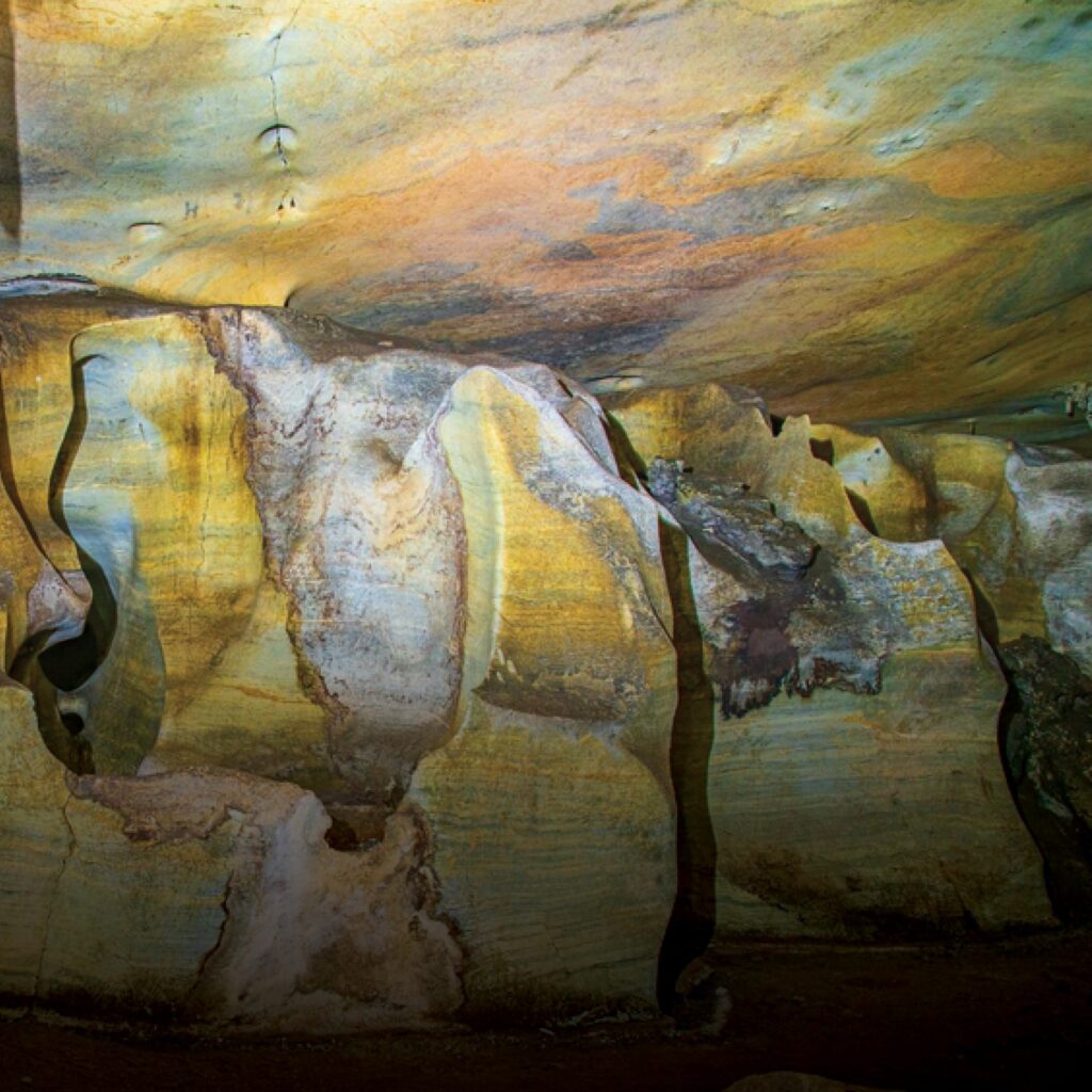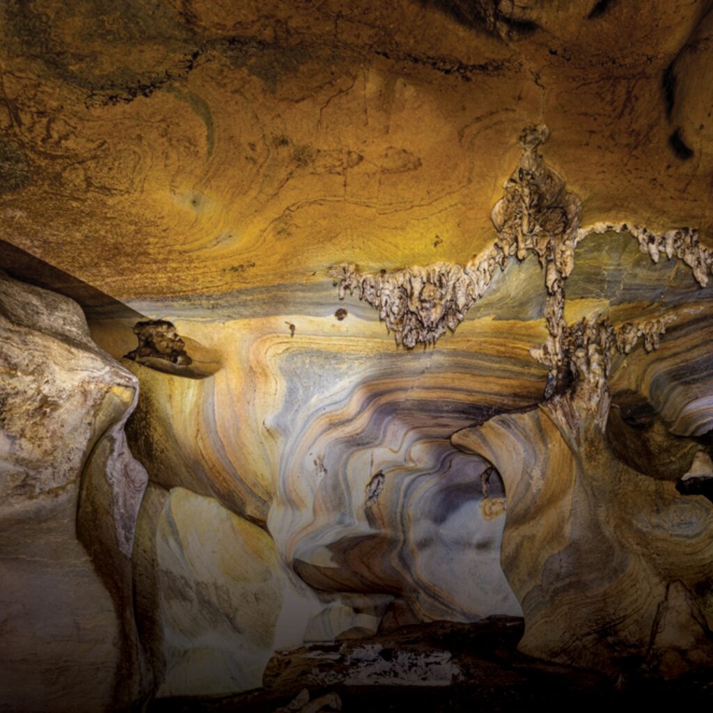 “ม่านสีรุ้ง” – ลวดลายบนผนังถ้ำเป็นริ้วแถบสีต่าง ๆ สลับกันไปอย่างสวยงาม ซึ่งเกิดจากแร่ธาตุต่างๆ ที่สะสมตัวกันโดยใช้เวลานาน