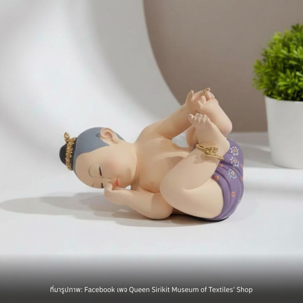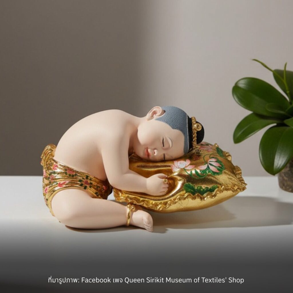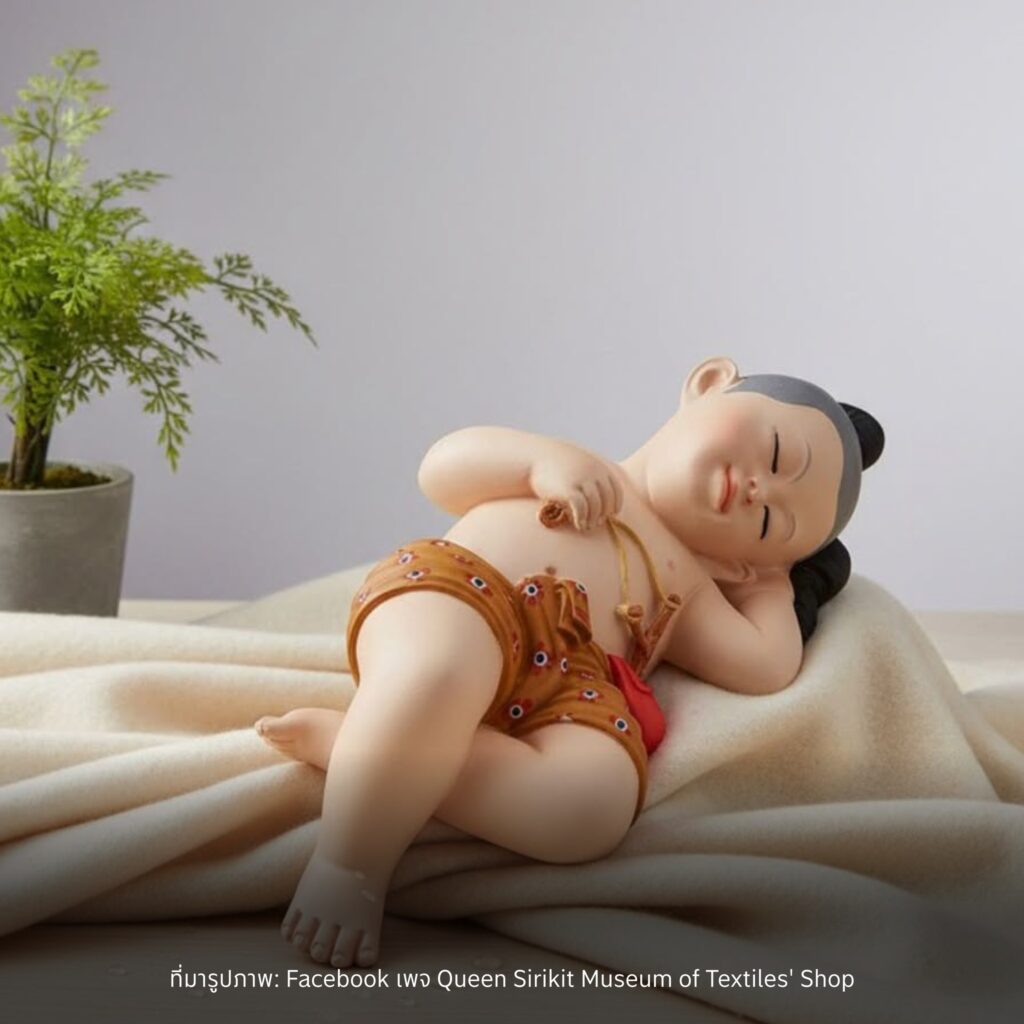 ความงดงามนี้ไม่ได้หยุดอยู่แค่ไม้แกะสลัก เพราะทางสถาบันสิริกิติ์ยังได้ต่อยอดสร้าง “ตุ๊กตาเด็กผมจุกวัสดุเรซิ่น” ที่ถอดแบบจากตุ๊กตาไม้โมกมันต้นฉบับแบบเป๊ะทุกดีเทล ผลงานเรซิ่นแต่ละตัวถูกปิดทอง ลงสี และเขียนลายด้วยมืออย่างประณีต มีเสน่ห์เฉพาะตัวแบบที่มองครั้งเดียวก็รู้ว่าเป็นงานฝีมือไทยแท้ ความละมุนของท่าทาง ความสดใส และบุคลิกแบบเด็กไทยโบราณถูกถ่ายทอดไว้อย่างครบถ้วน