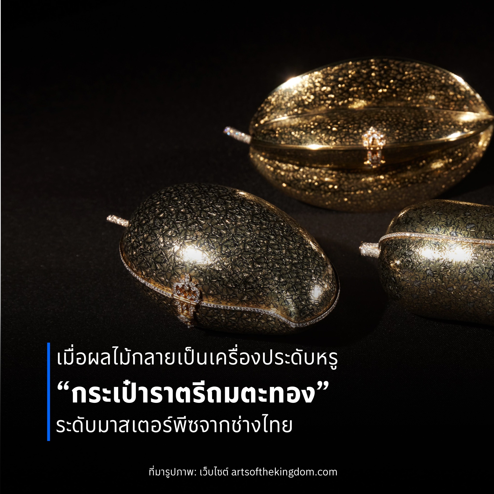 แต่ครั้งนี้…ศิลปะถมตะทองไม่ได้หยุดอยู่ที่ภาชนะหรือกล่องเครื่องประดับ เพราะช่างฝีมือไทยได้ยกระดับให้ ผลไม้ไทย กลายเป็น “กระเป๋าราตรีสุดหรู” ที่งดงามราวกับของใช้ของราชสำนัก