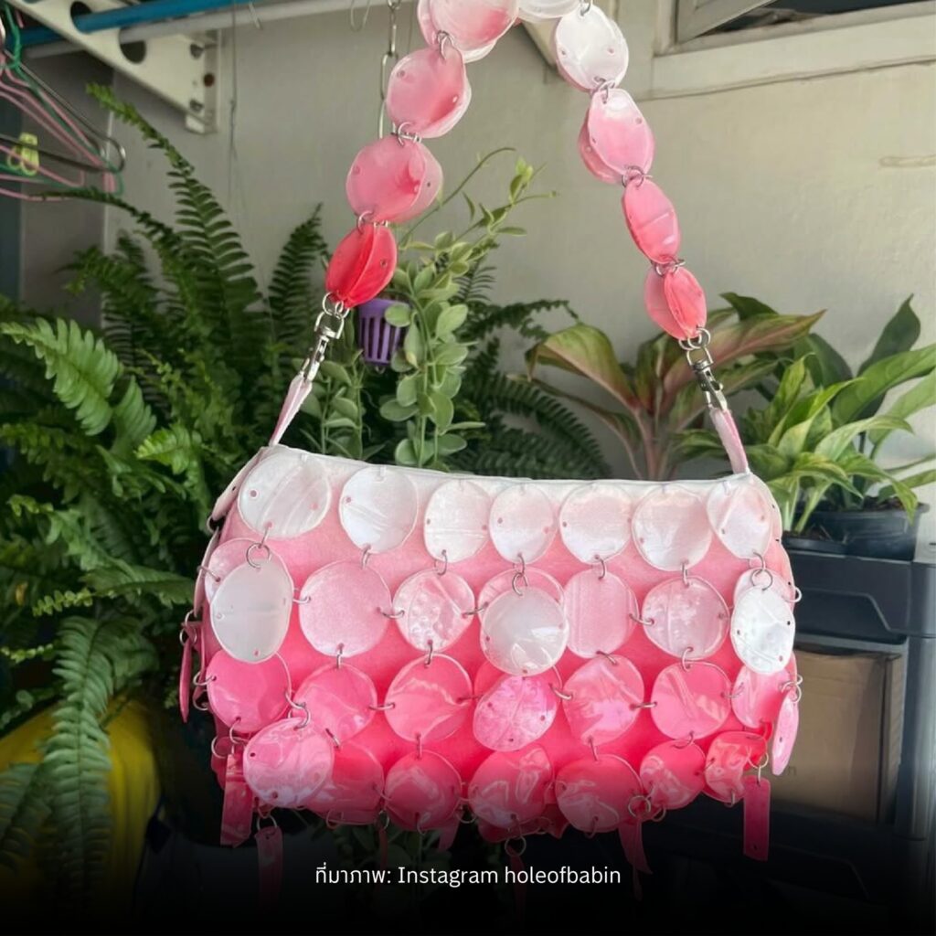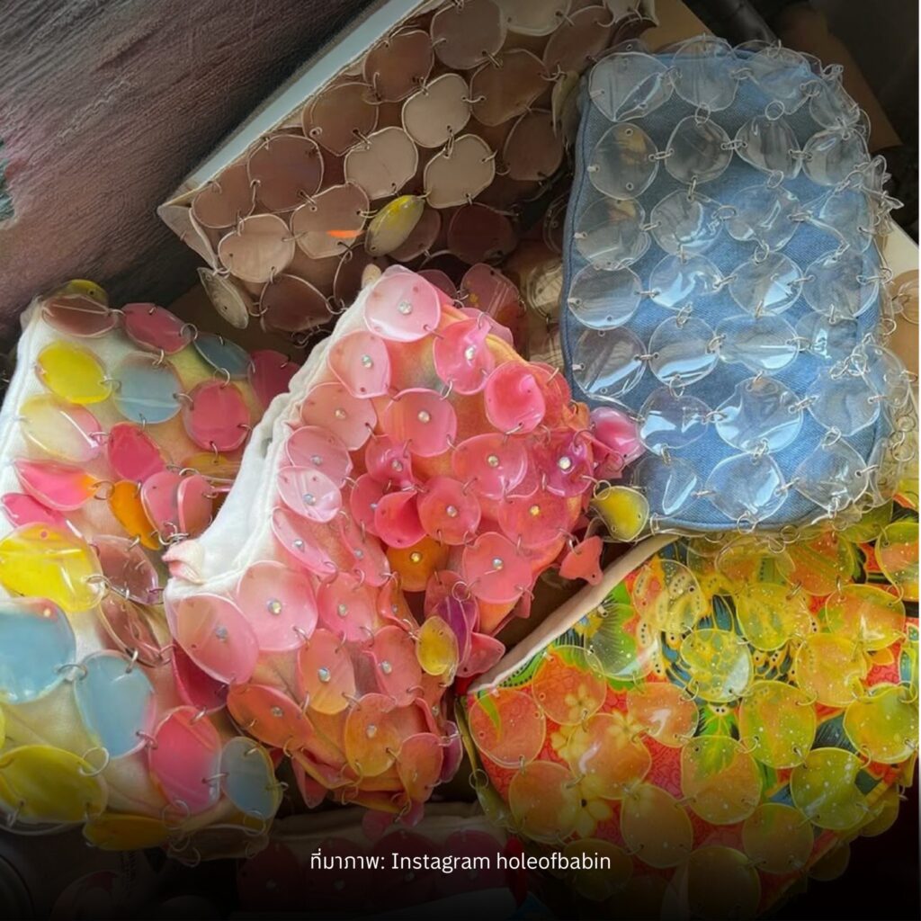 คอลเลกชันแรกเริ่มจากการนำขวดน้ำพลาสติกมาตัดเป็นวงกลมทีละชิ้น แม้จะเป็นงานทำมือทั้งหมด แต่ก็พยายามตัดให้ขนาดใกล้เคียงกันมากที่สุด ก่อนนำไปลนไฟเพื่อให้พลาสติกยืดหยุ่นและขึ้นรูปได้ จากนั้นจึงพ่นสีและเคลือบเงาเพื่อเพิ่มความทนทาน กลายเป็นกระเป๋าที่ทั้งรีไซเคิลและโดดเด่นในเวลาเดียวกัน ![]()
