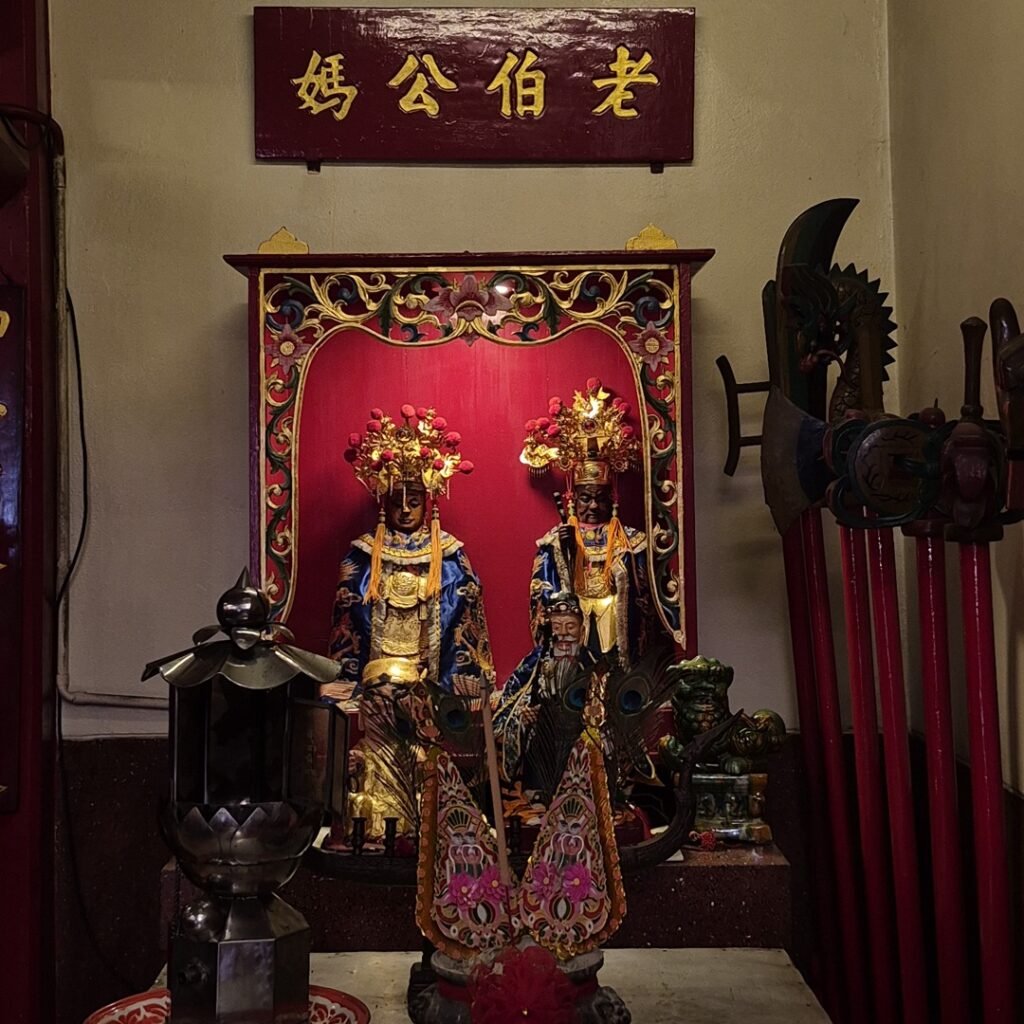 ภายในศาลเจ้ากวนอู จะแบ่งพื้นที่ออกเป็น 2 ส่วนติดกัน ส่วนหนึ่งเป็นศาลเจ้าแม่กวนอิม และอีกส่วนหนึ่งเป็นศาลเจ้ากวนอู มีเจ้าพ่อกวนอูเป็นประธาน ขนาบข้างด้วยบริวาร คือโจวชางและกวนผิง ตลอดจนมีเทพเจ้าองค์อื่นประดิษฐานร่วมด้วย เช่น แปะกงแปะม่า เป็นต้น ตลอดจนมีเจ้าพ่อจระเข้ ซึ่งเป็นกะโหลกตั้งอยู่ในศาลด้วย โดยเล่ากันว่าเป็นจระเข้ตัวใหญ่ที่มาเกยตื้นตายที่หน้าศาลเจ้า จึงถูกนำมาบูชา